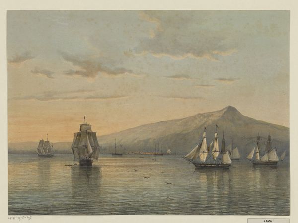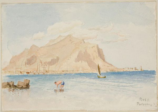 Editor: This is "View of Harbor with Four Sailboats," a watercolor print of undetermined date hanging here at the Art Institute of Chicago. Looking at it, I’m struck by how… gentle it feels. The colors are muted, soft, almost dreamlike. It’s pretty in an unassuming sort of way. What do you see in this piece? Curator: Oh, I’m with you. It's less a record of a harbor and more a whisper of one, isn't it? For me, this piece is like a half-remembered holiday, a fleeting impression captured on paper. I keep wanting to smooth the watercolor pigment even further. The scene isn't crisp or overly detailed, but, that is, maybe, the beauty of it. It embraces the essence of the place. Editor: So you're saying that its lack of distinctness contributes to the appeal? That's interesting. I guess I usually gravitate towards art with a stronger… statement. Curator: Right, but it’s still making a statement – just a more nuanced one! Watercolors often do. They almost invite us to meet them halfway. Where does your eye go first in the picture? Editor: Probably the sailboat on the left. It’s the largest, closest object. Curator: Exactly! See how it catches the light? How does that play against the darker shapes of the mountains? I think the contrast subtly creates depth, even without stark lines defining everything. What sort of story do you think is being told? Editor: Hmm, maybe a story of quiet everyday life in a harbor town, of gentle winds and the sea? The artist definitely isn't aiming for dramatic intensity. Curator: Indeed. Sometimes the power is in what isn't shouted, but instead, whispered into existence. I always learn new ways to engage with it by taking a good long pause. Editor: I agree. Thanks! It's helped me see beyond my initial… reserved response, I guess! Curator: Fantastic. Keep searching!