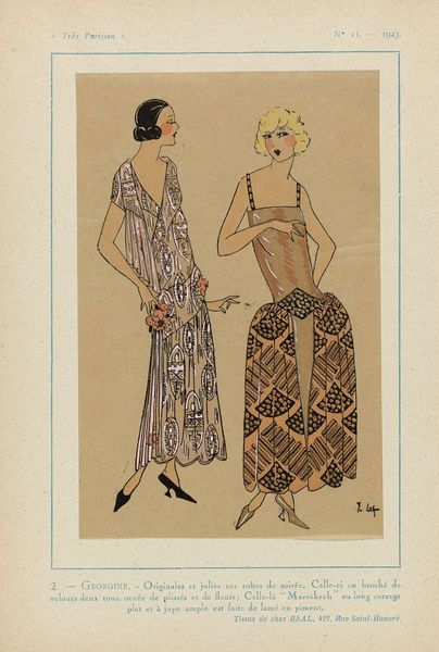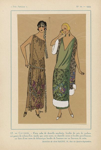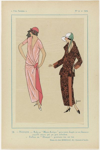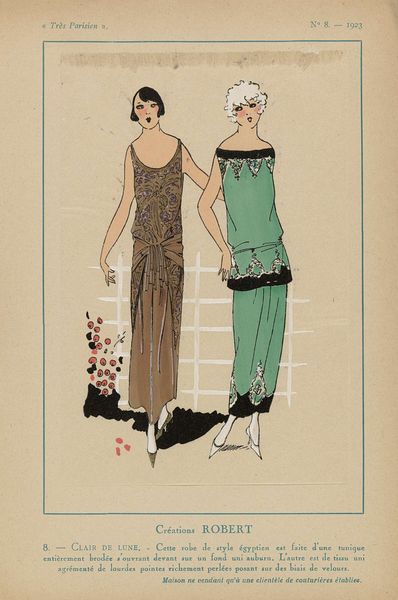This fashion plate, titled "Très Parisien, 1923, No 7: 16.- INSOUCIANCE," shows two women in silk pajamas. The colour palette is mostly pink and beige, with some black and red, and the marks are simple and clear. The artist used a few colours to create a sense of depth and form, but the drawing is mostly flat, more about the idea of silk pajamas than silk itself. The texture of the drawing is smooth, and the colours are transparent, which is typical of fashion plates. It's hard to say exactly what tools were used, but the lines are clean and precise. The simplicity of the marks really stands out, making it easy to see how each element contributes to the whole. The soft pinks and beiges evoke a sense of femininity and elegance, capturing the zeitgeist of the Roaring Twenties. This piece reminds me of other fashion plates from the same period, which focused on depicting the latest styles and trends. Like the artist Erté, the anonymous creator of this image was more interested in capturing the essence of a particular moment in time than in creating a timeless work of art. It’s an interesting reminder that art is a conversation, an ongoing exchange of ideas across time.
