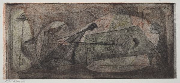 Editor: Adja Yunkers’ "The Circus," created in 1949, seems to explore the remnants of an event, capturing ghostly traces in graphite and charcoal. It has this very fleeting, ephemeral feeling. How do you interpret this work? Curator: Looking at "The Circus" through a socio-historical lens, particularly post-World War II, one might see the circus not as mere entertainment, but as a reflection of societal instability and displacement. These spectral figures become stand-ins for a population grappling with loss and impermanence. Do you see echoes of anxiety in the sharp lines and obscured forms? Editor: I hadn't considered the post-war context so explicitly. The harsh lines definitely convey a sense of unease, a sharp contrast to the light, ethereal quality. It makes the image feel unresolved, somehow. Curator: Precisely. Consider how the circus, traditionally a space of spectacle and communal gathering, is here rendered as fragmented and unsettling. This may speak to a broader breakdown of social cohesion following global conflict, or perhaps a comment on the illusory nature of spectacle itself. It challenges us to question what is being concealed beneath the performance. Editor: I can definitely see that tension now – the implied vibrancy of the circus against this washed-out, almost mournful palette. The figures feel trapped. Curator: Yes. Yunkers utilizes abstraction to confront issues that transcend the surface, reflecting the profound social shifts and emotional landscapes of his time. Thinking about abstraction more generally, does its inherently ambiguous quality amplify or diminish its power as social commentary, in your opinion? Editor: I think it amplifies it. By not being too explicit, it allows more room for individual viewers to find their own connections. It feels very relevant even today. Curator: Indeed. Today, it continues to serve as a haunting reflection on social structures. A testament to the power of art to hold a mirror to our collective experience. Editor: I agree. Thank you! This was eye-opening. I see this print so differently now.
