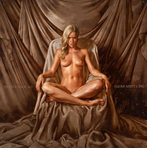 Aaron Nagel made this painting, Majesty, with a meticulous layering of oil paint. I mean, check out how he builds up the form, almost like he's sculpting with light. The way Nagel handles paint is interesting; it's both precise and suggestive, right? Like in the folds of the leather sofa, where the light catches, you can see the physical drag of the brush, tiny ridges that describe the texture. Then there’s that inscription in the background. It feels like a shadow, literally and figuratively, playing off the luminosity of the figure. Looking at this, I’m reminded of Lucian Freud, especially in the way Nagel captures the weight and warmth of the body, but with a contemporary twist that feels both classical and utterly now. It's a dialogue across time, another artist wrestling with seeing and representing.