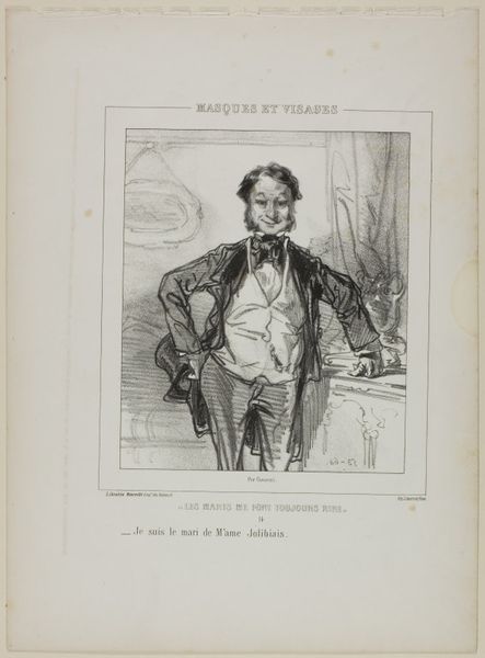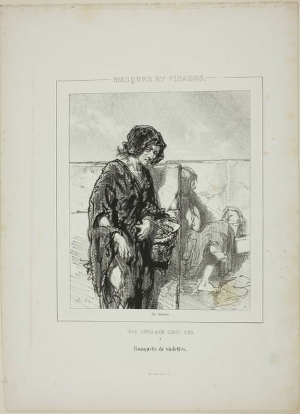 This lithograph, "Les Invalides du Sentiment: Raphael," was created by Paul Gavarni in 19th-century France. Lithography is a printmaking process that relies on the contrast between greasy and water-receptive areas on a stone or metal plate. The artist draws an image on the surface with a greasy crayon or ink. Gavarni's image gains much of its character from this process. The velvety blacks and subtle gradations of tone show a directness, a sense of the artist's hand, that can be lost in other forms of reproduction. This particular print is part of a series called "Masques et Visages," which translates to "Masks and Faces." Gavarni created a character study that appears to focus on the romantic figure. Lithography enabled the wide distribution of images in newspapers and books, playing a key role in shaping public opinion and popular culture. Gavarni's series speaks to the rise of celebrity and the commodification of artistic identity. It encourages us to consider the relationship between artistic production, social commentary, and commercial culture, and pushes us to question traditional art historical categories.