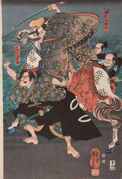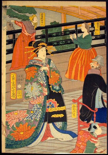 Editor: This is "Nambyō Ryōji" by Utagawa Kuniyoshi, a vibrant woodblock print. The composition seems intentionally divided between the domestic scene above and the… well, dental work below. What do you see as the defining characteristics here? Curator: Intriguing. The artist’s meticulous attention to line and form is evident, wouldn’t you agree? Observe the careful delineation of the kimono patterns versus the figures beneath. Notice too the interplay of flat planes and implied depth; how does this formal tension contribute to the work's meaning? Editor: It makes the upper and lower halves seem like distinct spaces, maybe commenting on different social strata? I hadn't considered the spatial dynamics so explicitly. Curator: Precisely. The strategic placement of these elements, their juxtaposition, serves to create a deliberate semiotic dialogue. Indeed, the tension between them shapes our interpretation of the whole, wouldn’t you say? Editor: That's a great point. I'll definitely pay more attention to composition and spatial relations in other works as well.