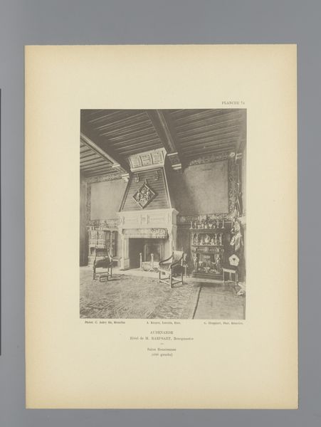 This is an image of the aldermen's room in the Oudenaarde City Hall in Belgium, and it seems to have been captured by G. Choppinet. The room's design emphasises local craftsmanship, particularly the monumental carved wooden fireplace, which is the focus of the image. This contrasts with the simple wooden furniture, including basic tables, chairs, and a storage chest. The fireplace is ornately sculpted with figures and decorative motifs, showcasing the skill of local artisans. The extensive labour and expertise necessary for the fireplace contrast with the other pieces of furniture, highlighting the significance of craftsmanship in civic identity. The choice of local materials emphasises the importance of regional resources. Together, these elements point to a cultural milieu where craftsmanship and local resources defined the public sphere. The image serves as a reminder of the link between governance, art, and everyday life, questioning the distinction between fine art and craft.