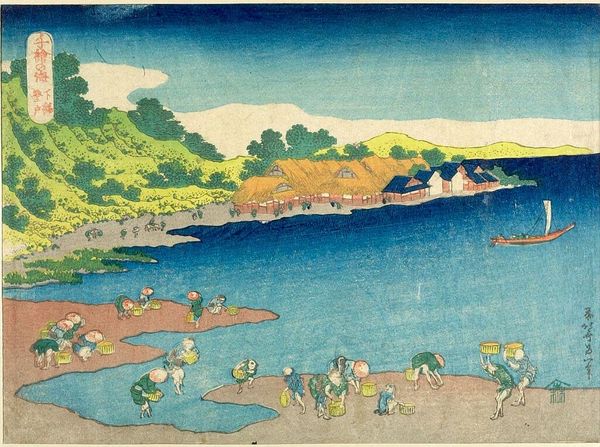 Curator: Katsushika Hokusai, renowned for his landscapes, created this print, "Sunset Glow at the Bamboo-Shoot Cliff," as part of his "Eight Views of the Ryukyu Islands" series. Editor: The composition strikes me as rather serene. The cool blues of the water and sky, combined with soft greens, give it a calming effect. Curator: Indeed. These Ryukyu prints, including this one, reveal a fascinating intersection of political agenda and artistic expression, commissioned following the islands' subjugation by the Satsuma domain. Editor: Ah, so the idyllic landscape serves a purpose beyond mere aesthetics. The precise rendering of the cliff and village speaks to the social hierarchies inherent in the landscape. Curator: Precisely. Hokusai employs distinct color blocks and sharp lines to emphasize the region's exotic appeal, yet it's very calculated. Editor: The placement of the boats adds a dynamic element, contrasting with the stillness of the land. Curator: Consider also how Hokusai uses space and perspective to craft an image both familiar and foreign. Editor: It's a reminder that even the most picturesque scenes are layered with history and purpose. Curator: A beautiful, complicated piece.