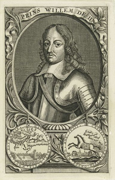 This is an undated portrait of Willem II, Prince of Orange, created by an anonymous artist. It’s rendered in a monochromatic palette with meticulous lines that define both form and texture. The composition centres on an oval frame, cradling Willem's likeness, around which organic foliate patterns flourish. Below the portrait, we see two circular medallions suspended, each depicting allegorical scenes. These elements introduce depth and complexity, inviting us to decode their symbolic meanings. The artist uses the formal structure of the portrait to reinforce the subject's status and legacy. Consider how the structured portrait form and the symbols interact. What fixed meanings might they challenge, and what new interpretations do they suggest about power and representation during that era? As you reflect, remember that the meaning of this artwork evolves with each new perspective we bring to it.