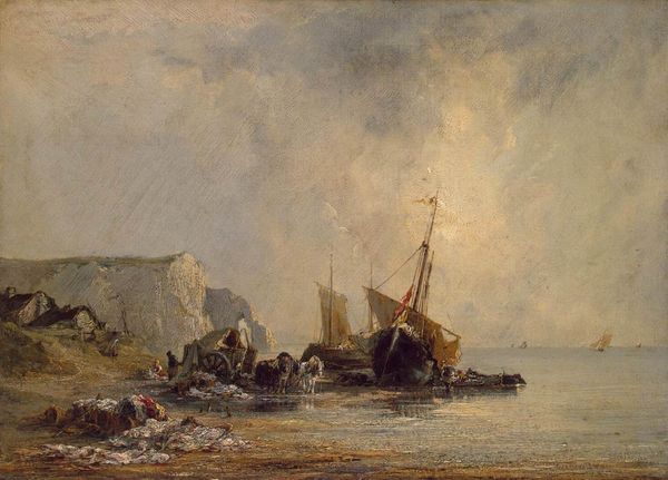 Curator: Amaldus Nielsen's "Fiskerhytter, Kinn," created in 1868, is a work painted en plein air using oil paints. Editor: The colors really grab you first, don't they? That muted palette creates a strong feeling of stillness, almost melancholic, and imbues this small-scale image with incredible spaciousness. Curator: The atmospheric quality definitely reflects the Romantic movement’s interest in capturing nature's emotional resonance. We see it in the choice of this location, a rustic fishing village; but think about the lives of people, maybe families, dependent on a reliable source for survival; the fishing industry is full of uncertainty, influenced by nature. The composition tells the whole story. Editor: Yes, the hut elevated on wooden piles is so striking! It is the visual symbol of the border between earth and water. I keep wondering what are these shapes that seem like dried fish suspended by that sort of derrick near the front of the structure; in turn, that calls my mind to traditional fishing communities, a kind of humble continuity. And in the sea the sailboats appear miniscule compared to the land... a David and Goliath thing perhaps. Curator: I read the fisherman around their boats almost as spectral figures; Nielsen captured them almost without detail in the foreground so you focus on the natural elements in the landscape; the rugged terrain and expansive sky are dominant, even despite that the village seems settled. Consider gender too: women in these communities probably experienced higher rates of psychological distress connected to economic challenges as fishing income could determine survival. Editor: And that monolithic island in the distance further enhances the sublime effect. What I find striking is the fact the cloud is bright; for some reason, my first impression was that this may refer to good expectations, fortune, good days in terms of natural resources for the village… perhaps a symbol. Curator: Yes, Nielsen masterfully evokes a complex emotional landscape tied directly to human existence and natural setting. Considering his wider body of work and the social-economic conditions in Kinn, this is likely to address more widely shared struggles, especially within gender, across Europe at the time. Editor: Looking at the light interacting with the clouds, I am reminded about the many sides any interpretation can develop by a painting like this… A painting offers a glimpse into a time and invites multiple interpretations.