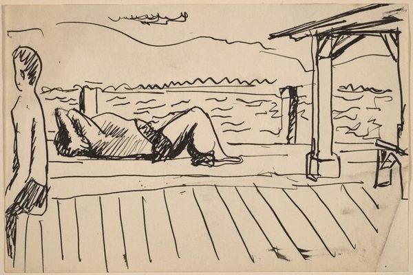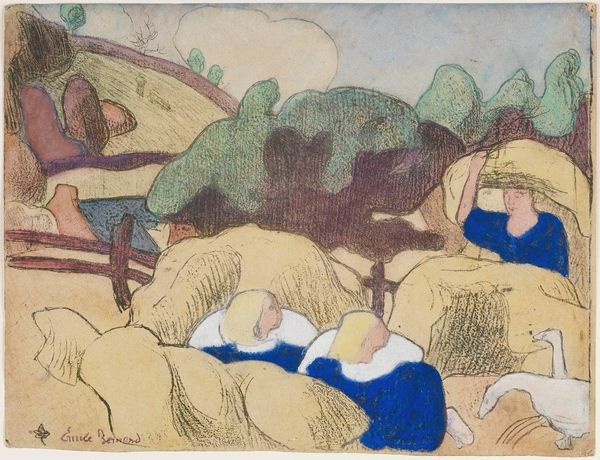 Curator: Emile Bernard, "Bretons dans une barque", painted in 1889. The artwork captures a scene with Breton figures in a boat, rendered in oil paint with characteristics reminiscent of Impressionism. Editor: Ah, it hits you with a sort of subdued intensity, doesn't it? Muted tones, a quiet stillness, but those figures… something almost dreamlike in their faces. Like they're sailing not just on water, but into a memory. Curator: Bernard was quite taken with the region of Brittany in France. You can feel how artists like Bernard became enthralled with representing idealized notions of 'traditional' peasant culture, somewhat separate from the urbanized France to the East. There's a whole visual economy there, and it spoke volumes about national and regional identities at the time. Editor: "Visual economy," I like that. And yes, I see it now. It's as though he's trying to hold onto a vanishing way of life. It has a melancholic feel to it, I'd say. And that dominant black sail at the margin – a striking contrast, creating tension. What would it have felt like to experience the world through Bernard’s eyes? Curator: Definitely. The composition pushes our attention forward with a clear intent, from those somber foreground figures to the middle-ground activities, then far off to the high horizon line. Bernard places Breton folk almost as characters in a symbolic panorama of Breton life, shaped as much by the observer as those observed. Editor: Symbolism for sure – their eyes are heavy, weighted. Look, there’s even a smaller boat receding from our characters’ viewpoint. Beautifully realized through its form and visual construction. Makes me want to contemplate what realities slip through my own fingers every day, the cultural moments I miss. Curator: It's powerful to consider the layers here – from Bernard's personal engagement with Brittany, to the broader politics of cultural representation in late 19th-century France. I’m consistently drawn to what isn't explicitly said. Editor: Me too. Thanks, "Bretons dans une barque", for pulling me in. The currents of time and place swirl powerfully around it.