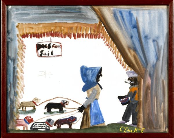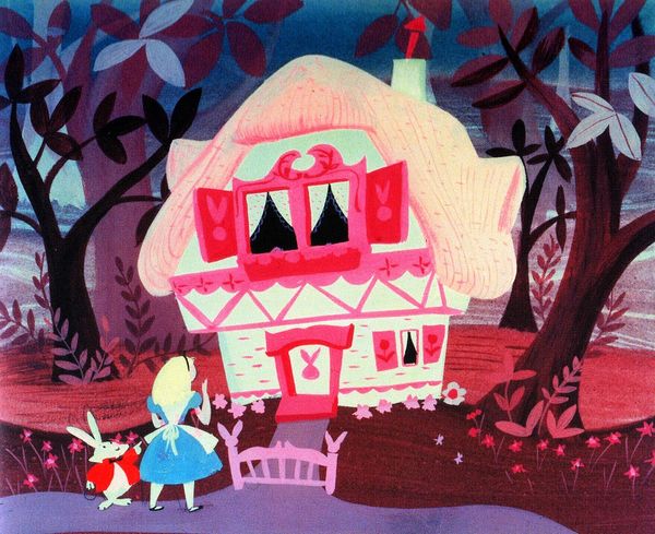 Editor: Here we have Mary Blair's "Alice in Wonderland", a painting. The whimsical composition gives it such a playful, almost childlike feel, doesn't it? What aspects of its visual form stand out to you most? Curator: Formally, I'm immediately drawn to the interplay of contrasting colors. Note the juxtaposition of the cool blues and purples of the forest against the warm yellows and greens of the house and surrounding landscape. This creates a visual tension, heightening the dreamlike quality. The spatial relationships, too, are of interest; what are your thoughts? Editor: I see the wonky angle of the house. Is it simply to communicate its topsy-turvy character? Curator: Perhaps. But consider also the flatness of the picture plane. Blair avoids traditional perspective, flattening the space and pushing the image towards abstraction. Observe how the graphic style reinforces this; it prioritizes simplified shapes and bold outlines, reminiscent of modernist design principles. Do you find these visual elements create a sense of unease? Editor: Yes, there’s definitely something unsettling beneath the surface. Even though it’s very bright, there's this undercurrent of strangeness. Curator: Indeed. And consider, ultimately, how the synthesis of colour, space and graphic style evokes a sense of both wonder and disorientation—core themes found in Wonderland. What have you learned during this conversation? Editor: It really made me think about how colours, shapes and perspective can all affect my interpretation of a painting. Thanks. Curator: I, too, find it instructive to consider how even seemingly simple compositions yield unexpected complexity upon deeper reflection.