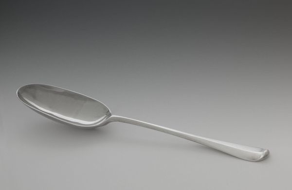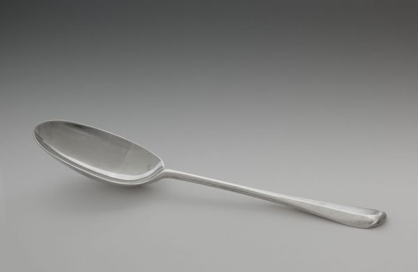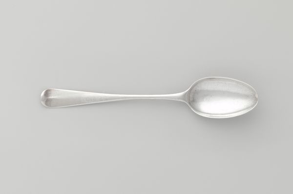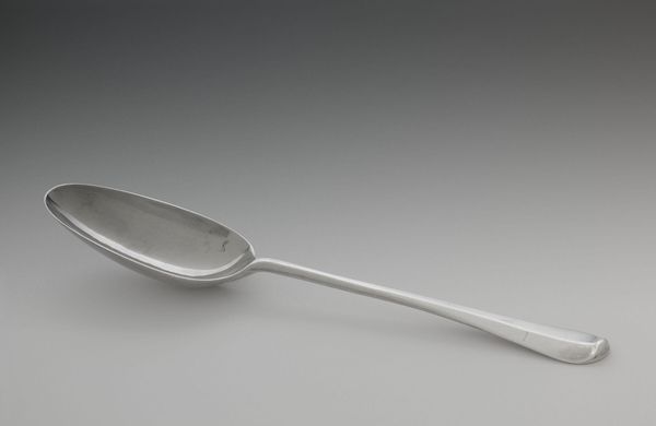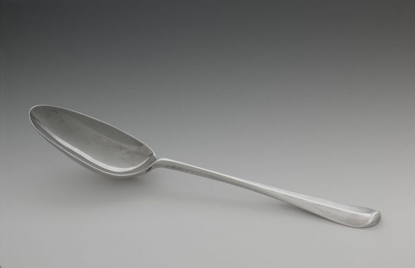 Curator: First impressions—it gleams. Almost lunar. Editor: And utilitarian, don't you think? Here we have a baroque silver spoon crafted by Benjamin Wynkoop, dating back to the early 18th century. It resides now at the Metropolitan Museum of Art. Curator: Utilitarian objects humming with stories. Imagine what hands held this, what lips it fed? I see entire histories reflected in its polished surface, ghosts of soups and maybe tears... oh dear. Editor: Right, and those "ghosts," as you say, were likely wealthy patrons. Silver was a commodity. To have a spoon like this signified not only utility but conspicuous consumption. It speaks to labor as well, the silversmithing and craftsmanship that went into its creation, the access to precious materials and production. Curator: So it is the silent language of wealth made manifest? But still, there’s an artistry to even its simplicity. That slight curve to the handle, the weight, and balance… Doesn’t it strike you as being perfectly sculpted? Editor: I notice the way its design reinforces social stratification, it also strikes me how spoons from the past were a luxury. And luxury always implicates privilege and power. What do you imagine was eaten with it? Curator: Syllabub? Pottage? Something frothy and delicious. Perhaps that's too fanciful, though, in my vision it would have to be a bit of sunshine and pure decadence in a time that could likely use it. We so often overlook the humble spoon but in looking deeply at it, we begin to grasp the lives and hands connected by something so mundane. Editor: The point is it wasn't mundane at all. It reflects the period in which it was crafted. A baroque expression of social and economic factors, now here, polished for our collective contemplation. Curator: So then, is it merely a spoon? Editor: No, it is the cultural context of it's origins cast in gleaming silver.
