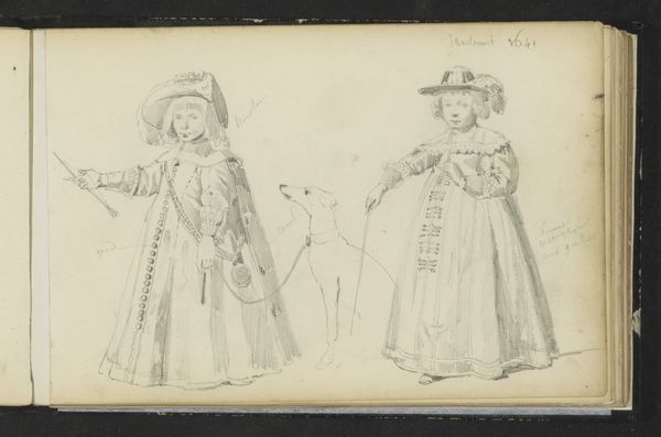 Curator: Looking at this pencil drawing, titled "Studier af to kvinder med parasol og en arbejdende kvinde"—that's "Studies of two women with parasols and a working woman"—created sometime between 1822 and 1848 by Christen Købke, I immediately get a sense of intimate observation. Editor: Intimate and stark, almost melancholy. There's something about the emptiness surrounding these figures, these women, that speaks of isolation and the disparate realities of 19th-century Danish life. Two women shielded by parasols and a worker bearing a heavy load. Curator: Precisely! It’s interesting how he positions the women; the parasol carriers appear delicate and almost floating. And then you have the laboring woman who appears much more grounded by her burden, literally and figuratively, she's shown carrying what looks like milk pails. Köbke has created this world within the sketch. It feels like the moment he had paused and considered existence. Editor: It’s a candid, almost documentarian glimpse. You have these distinct social classes rendered side-by-side, emphasizing their separation but, paradoxically, connecting them within the same frame, on the same page, within the same social and economic system. The parasols act as markers of privilege but they also conceal something—perhaps a shielding from the realities faced by the working woman. Curator: Yes, the women holding parasols, I sense them as shy, the lines delicate almost a feeling that it is barely there, compared to the clear shape of the laboring woman and her burdens. Editor: The very medium—pencil—feels significant. Pencil allows for erasure, for redrafting, reflecting perhaps the impermanence and fluidity of social identities. It challenges that sense of social position as pre-given and unchangeable, instead allowing space to explore it. And this portrayal in the sketchbook feels like a space to pose some questions regarding society. Curator: Indeed! You can almost feel him deciding on the figures' forms. The way Köbke captures the fleeting glimpses of daily existence is, for me, just beautiful. It resonates with a deeper exploration into what it meant to be alive. Editor: It urges us to confront the historical inequalities and the labor exploitation embedded within what we might naively perceive as a simple, unassuming, genre painting. It reveals those things so discreetly—in pencil lines! Amazing how one can use that tool so poetically and provocatively at once. Curator: Well put!