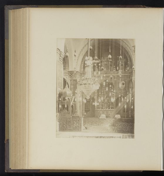Curator: Before us is "Interior of the Church of the Holy Sepulchre in Jerusalem," an albumen print created between 1867 and 1885 by Félix Bonfils. Editor: The architectural details here feel almost oppressively ornate. It’s dizzying, yet undeniably powerful. The tonal range in the print is quite subtle; it lends the whole image an otherworldly feel. Curator: Indeed. Bonfils, along with other photographers of his time, catered to a growing European interest in the Holy Land. These images served not just as documentation, but also as powerful symbols of colonial presence and cultural fascination. Editor: Notice how Bonfils frames the central opening; he employs symmetry that leads the eye directly to that shadowy interior, almost like a stage set. This meticulous construction adds a dramatic and sacred element to the depiction. Curator: Absolutely. The Church of the Holy Sepulchre is incredibly significant—believed by many Christians to be the site of Jesus' crucifixion and resurrection. By capturing this interior, Bonfils wasn’t simply creating art; he was also producing a kind of relic. Editor: I’m captivated by the variations in textures—the smooth surfaces contrasted with the intricate carvings. Bonfils skillfully captures this diversity using light and shadow. This approach highlights the elaborate craftsmanship. Curator: Furthermore, the sale and distribution of these photographs allowed a broad audience to experience a space most could never visit. It fueled a visual culture centered around religious and historical tourism. Editor: The photograph offers a striking glimpse into another time; it's so compelling to analyze how the photographer carefully constructed the composition, utilizing elements of light and shadow. Curator: Reflecting on it, Bonfils gave access and simultaneously participated in shaping perceptions of a sacred place through the very act of representing it. Editor: It is an invitation to view not only an edifice of faith but to contemplate the mechanics behind our perception.