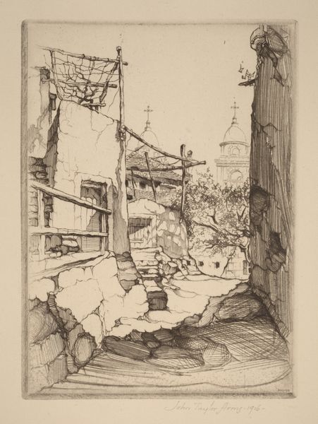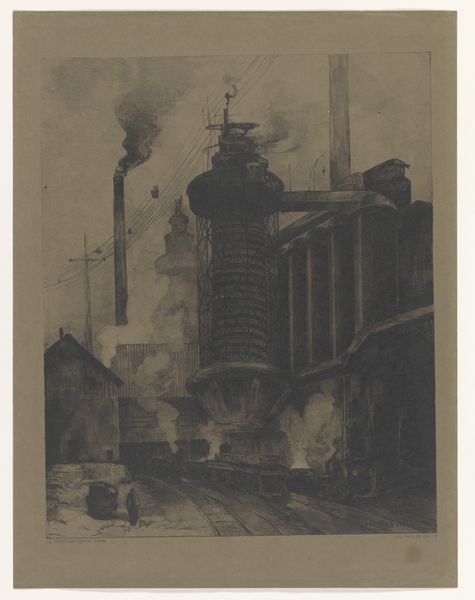 Curator: Auguste-Louis Lepère's etching and engraving, "Quartier des Gobelins," part of his "Le Long de la Seine et des Boulevards" series, provides us a compelling cityscape, possibly dating from 1889 to 1910. What strikes you about it initially? Editor: A sense of overwhelming urban oppression. That sky choked with smoke, those relentless buildings pressing in…it feels almost dystopian. The artist seems intent on showing the toll industrialization took on the everyday Parisian. Curator: The formal qualities support that reading. Notice the dense concentration of lines, creating areas of intense dark value, balanced by the stark white of the paper in the foreground. Lepère masterfully uses the etching technique to convey depth and atmospheric perspective. The tall chimneys are a focal point, yes, but also compositional devices drawing the eye upwards. Editor: Exactly, those chimneys, those plumes—they symbolize the relentless encroachment of industry. What about the residents, the unseen people breathing in that air? How did these conditions impact working-class communities, particularly concerning health and economic disparities? This piece almost acts as a form of early environmental protest, unveiling what was often veiled in celebratory images of modernity. Curator: Certainly, that reading holds weight. The contrasting textures—the rough, almost chaotic lines of the buildings versus the smoother gradations of the sky—reinforce the tension between the built environment and the natural world. Structurally, one could even say this discord forms the crux of the composition itself. Editor: And let’s remember, the area of Gobelins was deeply tied to the tapestry industry. Consider how that industry shaped its social fabric, often exploiting vulnerable workers. I believe this print invites a critique of capitalism's relentless march. Curator: It offers an intense engagement for any viewer willing to meet its gaze, for sure. The rigorous rendering of its subject in precise visual terms makes for a work capable of speaking across decades. Editor: Yes, an important reminder that beauty and truth can often emerge from documenting even the most uncomfortable realities. Its beauty is that it offers an important portal for further exploration.