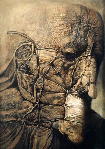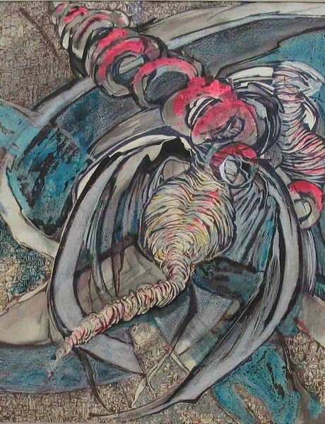 Editor: Here we have Małgorzata Serwatka's "Dauka 11," painted in 1987 using acrylic paint. It strikes me as a complex, almost overwhelming image, like a dream pulled from the depths of memory. What do you see in this piece? Curator: I see a powerful commentary on the societal expectations placed upon women, particularly in the late 20th century when this was created. The distorted figures, the use of heavy, almost suffocating shapes—it speaks to the pressures of conforming to beauty standards, of being weighed down by expectations. Editor: The figures do seem distorted and burdened. What about the patterned background? Does that relate to those pressures? Curator: Precisely. The background reads almost like a script, or maybe even branding, layered upon layered, suggesting a cultural text that dictates and confines. Consider the Polish context of 1987, still under communist rule but with Solidarity movements gaining momentum. What kind of imagery would an artist like Serwatka choose to represent the female body when cultural identity was becoming increasingly politically charged? Editor: So, you're suggesting it's a political piece as well, about freedom of expression and perhaps even women's liberation within that socio-political landscape? Curator: Exactly. It is difficult to separate social movements, like the feminist movement, from politics. "Dauka 11" doesn't exist in a vacuum, but actively communicates with art’s public, embedding Serwatka within conversations on Polish identity and expression. Does understanding that change your initial reading of the image? Editor: It definitely does. I initially saw a personal struggle, but now I recognize the broader social implications. Thanks for that. Curator: It highlights the significance of art as a tool for social dialogue, sparking discourse even today.