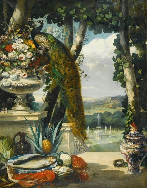 Curator: I find "View of a Terrace" quite intriguing, painted, we believe, by Melchior d'Hondecoeter. It presents this layered composition dominated by this Italianate architectural space. Editor: Immediately, the painting evokes a sense of both prosperity and mortality; there's such lushness in the architecture and plant life, but the hunted game in the foreground tells a different story. Curator: Precisely. The formal elements are skillfully arranged, aren’t they? Notice how the golden ratio seems to govern the placement of each structure, directing the viewer’s eye along the receding planes. And the oil-paint, a masterful application building depth. Editor: Oh, undoubtedly. And the contrast between the live animals and the dead game! It's symbolic of abundance wrested from nature. A demonstration of human mastery but also its precariousness, hinting perhaps at our own end. The dog, looking rather melancholic, is it a symbol of fidelity or grief? Curator: Perhaps both. Though more formally, notice how his placement guides the eye, completing the spatial rhythm. It leads you up the staircase past the young boy carrying a plate... Editor: He looks so vulnerable, burdened even. With death just beneath him; such youth pressed into a cycle it may not yet understand. And a single white duck in the extreme foreground--whiteness, for purity and sacrifice perhaps? Curator: Semiotics run deep. Yet it is the very tension inherent between these layers, a study of form itself. The juxtaposition and play of horizontal and verticals provide so much dynamic texture. Editor: True, that framework reinforces a power dynamic--those animals, and that young boy, forever in its thrall. I'm compelled to note how little their state changes despite that gorgeous light, locked by brushstrokes into our cultural consciousness. Curator: Absolutely, an intricate relationship unfolds when you consider it holistically, as its arrangement asks one to. This, indeed, provides unique insight. Editor: And in deconstructing these symbolic links and considering human elements within a timeless space, it compels a reflective pause in today's rapidly changing landscape.