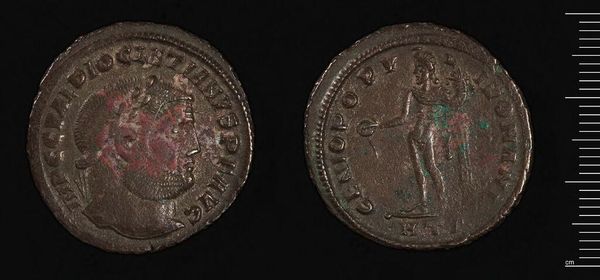 Editor: This is a Follis of Maximinus II from Alexandria. It’s attributed to Maximinus Daia. It's small and made of what seems like bronze. What strikes me is how the act of minting transformed raw metal into a tool of imperial power. What do you make of it? Curator: Absolutely. The coin’s material composition and method of production reveal much about the Roman economy and social hierarchy. Who controlled the mines, the workshops? Who profited from its distribution? These are key questions. Editor: I hadn’t considered the mines! So it’s not just about the final image, but the whole production chain? Curator: Precisely. The object itself becomes a record of labor, trade, and political control. Thinking about it in this way, it gives us a different view of Roman history. Editor: I'll never look at a coin the same way again.