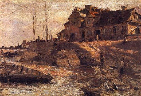 Konstantin Alexeevich Korovin created this oil painting, "In the North," with dynamic brushstrokes that capture the raw essence of a northern seascape. The canvas is alive with movement, dominated by the interplay of light and shadow on water. Korovin’s composition is structured around a stark contrast between the solidity of the boats and buildings on the left, and the fluid reflections rippling across the water's surface. The heavy application of paint lends the scene a tactile quality, enhancing the viewer’s sensory experience. We see the influence of Impressionism in Korovin’s attention to capturing transient moments and atmospheric effects. The muted palette reflects the cool, diffused light typical of northern locales, yet it is used with a vibrancy that destabilizes conventional representations. The interplay of these elements encourages us to look beyond the literal scene and consider the deeper structures that shape our perception.