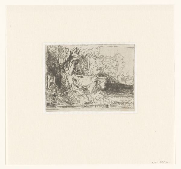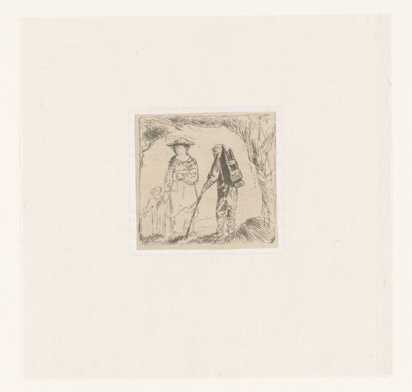 Curator: This etching, titled "The flute player ('Het Uilenspiegeltje')" made sometime in the 18th century by an anonymous artist, features an almost theatrical pastoral scene. The mood seems both idyllic and unsettling, wouldn’t you agree? What resonates with you most strongly when viewing this print? Editor: That's a great starting point! The woman and flute player seem self-absorbed, while the presence of the goats and other figure seems almost intrusive in their intimate space. What can we interpret about gender or class within such genre scenes during this period? Curator: Absolutely. Examining the figure with the goats offers critical insight. The composition subtly challenges conventional hierarchies. Genre painting often idealizes the peasantry. I see a simultaneous romanticizing and othering of rural life, creating a space to interrogate social structures. Where do you see elements of social commentary or resistance, if any, within the artwork’s context? Editor: The detail in the woman's dress does strike me as a bit of an elevated presentation for this kind of scene. Curator: Indeed. Consider her dress, perhaps symbolic of prosperity, a rising middle class appropriating aspects of leisure once reserved for the elite. What this could say about power dynamics at the time? How does this scene intersect with burgeoning capitalism and shifting social identities? Editor: That's fascinating. It's making me think about art's role in reflecting and also shaping these changing social narratives. I'd assumed genre scenes offered more transparent insight into everyday life, but there is an additional layer of intention behind it. Curator: Precisely! This print invites a complex reading beyond a surface level. By probing deeper into these socio-political layers, we unravel not just art history but also the very fabric of past societies and how identity, class and gender all become negotiated and asserted in the visual culture of the time. Editor: It makes the image far more complicated, and I am more interested in the piece because of the rich social backdrop that we uncovered. Curator: Exactly, and these sorts of perspectives allow us to truly engage with artwork's multifaceted value, allowing past contexts to shed light on contemporary social justice concerns.
