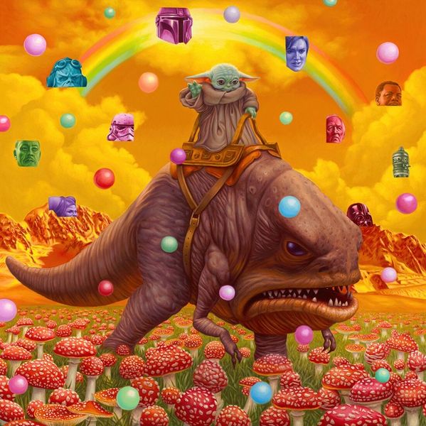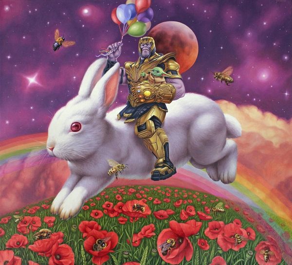 Alex Gross’s digital painting, "Prison of the Mind," presents us with a potent array of symbols from modern anxieties, rendered with striking precision. Two figures dressed as the Joker from different eras of Batman stand amidst a sea of pills, overlooked by portraits of other clowns and Batman himself. The clown, historically a figure of jest and chaos, here embodies a deeper sense of societal unease. The pills, modern symbols of cure and control, are scattered like debris, suggesting a world overwhelmed by its own remedies. Notice, too, the burning monkey, a symbol of destruction, and the unicorn, a mythical symbol of purity and grace. Consider how the Joker's mask, reminiscent of the Commedia dell'Arte's Harlequin, has evolved from a symbol of comic relief to one of menacing unpredictability. This transformation reflects our collective subconscious anxieties about societal breakdown and the fragile line between sanity and madness. These elements, charged with historical and cultural weight, engage us on a profoundly psychological level, confronting us with the cyclical nature of order and chaos, cure and ailment.