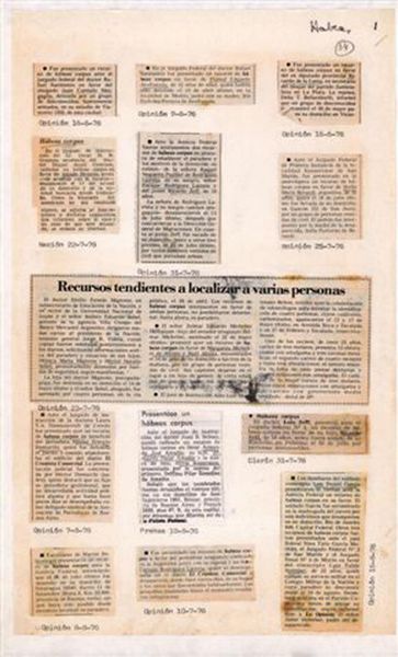 Editor: This untitled work by León Ferrari consists of newspaper clippings, roughly A3 in size. The headlines are grim: bodies found, assassinations… What does this collage convey to you? Curator: Ferrari often used collage to critique political violence and the role of the media. Look at the dates scribbled beside each article. These repetitive reports of violence underscore the systematic nature of state-sponsored terror in Argentina. Editor: So, it’s about the dissemination of news as much as the events themselves? Curator: Exactly. The artwork acts as a kind of archive, highlighting the constant stream of brutality that became normalised. Did the normalization become a tool for silencing dissent? Editor: I see. The accumulation makes it more powerful. It’s a stark reminder of the dangers of unchecked power and a controlled narrative. Curator: Indeed, and how easily such narratives can become ingrained in public consciousness.