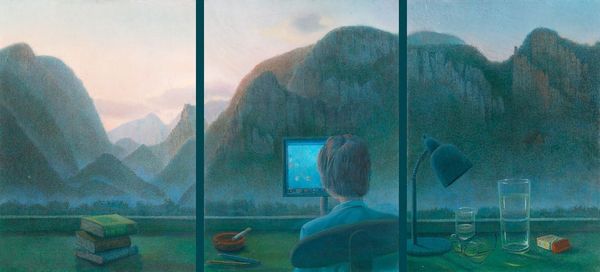 Curator: John Berkey's "Red Car," created in 1994, presents us with an intriguing intersection of modernist aesthetics and figuration. Editor: Zoom! Immediately, I'm getting this intense feeling of velocity, almost like a futuristic postcard—but with a very retro soul. I mean, that sunset palette—delicious! Curator: Absolutely. Berkey, primarily recognized for his science fiction and space art, also engaged with themes of transportation and the evolving urban landscape. Here, his cityscape backdrop speaks to architectural utopianism and the possibilities of modernization. Editor: It feels both thrilling and, dare I say, slightly dystopian. That lone driver encased in what looks like a candy shell—totally isolated. What does that suggest about our relationship to technology, and even each other? Is he blissfully cruising, or hopelessly detached? Curator: I think that's key. We're seeing here the individual framed within systems of transit and control. The raised track further emphasizes this sense of prescribed movement, evoking Foucauldian notions of power and spatial organization. Editor: Okay, Foucault—but can we also appreciate the pure aesthetic pleasure? Look at how that oil paint just gleams, especially that crimson pod-mobile, so sleek. And the almost dreamlike quality of the clouds above? Curator: Right. The painting complicates ideas about progress and personal liberty within the context of urban design. The elevated structure introduces concepts related to social stratification. How does the infrastructure serve—or perhaps control—access and movement for diverse communities? Editor: It's funny, isn't it? Berkey's so-called 'future' feels incredibly rooted in a particular kind of late-20th century optimism and anxiety. It’s making me reflect about how past imaginings impact our current reality, too. Curator: Precisely. By examining pieces like “Red Car," we see a narrative woven between futurism, societal critique, and ultimately, questions of who benefits—or gets left behind—in this so-called pursuit of progress. Editor: Well, I know one thing – after looking at this piece, I'm desperate to cruise off into that sunset, even if it's just in my slightly less futuristic ride! It stirs up such a sense of possibility, mixed with a touch of wistful contemplation, for sure.