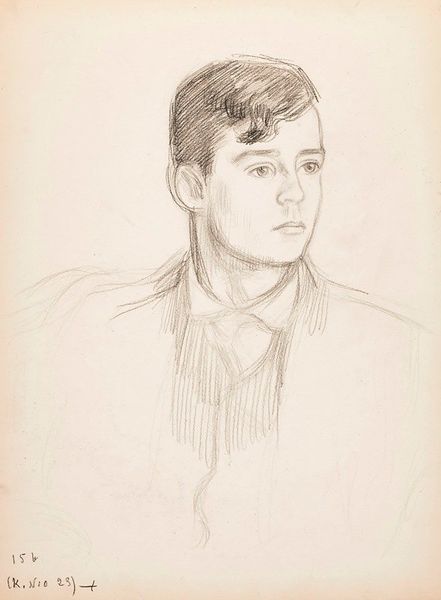 Editor: This is an untitled pencil drawing, dated sometime between 1905 and 1915, by Jan Preisler, currently housed here at the Met. It's a fairly simple portrait, but the upward gaze gives it a really hopeful or maybe even yearning quality. What draws your eye in this work? Curator: The strength lies in the formal elements. Notice the subtle modeling of the face, achieved through the careful hatching and cross-hatching with pencil. It builds volume, defines bone structure, and most importantly, guides our eye. Editor: Yes, the light and shadow definitely create the shape. Curator: Exactly. And consider the composition. The artist placed the figure off-center, looking upwards and slightly out of frame. This imbalance creates a dynamic tension. Semiotically, the upward gaze often represents aspiration or spiritual seeking, which adds another layer of interpretation. Editor: It’s interesting that a simple drawing technique can convey so much depth. Curator: Precisely. Consider the line work itself. At times, the lines are bold and definite, delineating the contours. Elsewhere, the lines are light and almost evanescent, creating a sense of ethereal fragility. Editor: So, the drawing isn’t just about the subject matter but also the language of the lines themselves. Curator: Indeed. Preisler isn’t just showing us a person; he's using the formal elements of art to communicate something about human longing and the power of seeing itself. What at first seems like a basic drawing reveals complexity in its visual syntax. Editor: I didn't quite see that level of intent until now. Thank you. Curator: My pleasure. It reveals itself more fully with closer study of those key structural choices.