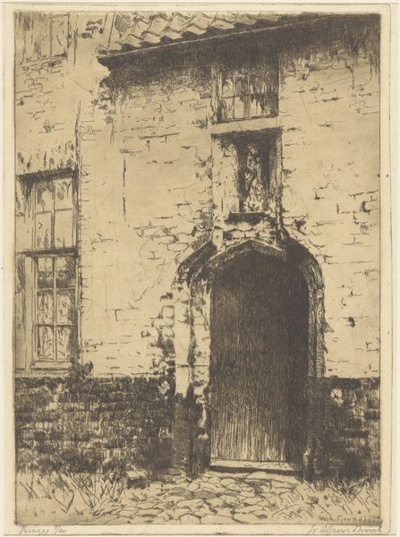 Editor: Here we have David Young Cameron's 1902 etching, "Beaufort's Tower, St. Cross." The monochromatic print, dominated by the imposing tower, evokes a feeling of quiet grandeur and perhaps a hint of melancholy. What stands out to you when you look at this work? Curator: The immediate impact is indeed the tower itself. Cameron's skill in etching captures not only the architectural detail but the very weight of history embodied in those stones. The tower isn't just a structure; it's a symbolic gateway, a visual marker between eras. Notice how the play of light and shadow seems to almost animate the stonework. Do you get a sense of figures from the past passing through that archway? Editor: I hadn't considered it that way, but now that you mention it, yes! There's a blurry quality to the figures underneath the arch, a transient sensibility, and maybe a connection to the beyond. Curator: Exactly. The archway and its inhabitants are a deliberate choice on Cameron's part. He understood the symbolic power of architecture, how certain buildings accumulate cultural memories. The tower represents permanence but the shadowy figures suggest the continuous stream of humanity. And what does the lack of clear depiction mean to you? Editor: I would say it points to the ceaselessness of time, the ever-present, ephemeral nature of existence, moving in and out of history. Curator: Precisely. Cameron has layered symbolism onto a familiar architectural form. It’s an emotional portrait rendered not in flesh and blood, but in stone and shadow, prompting reflections on the transient yet enduring nature of life itself. Editor: That makes me see it in a completely different light, it adds another dimension. Thank you! Curator: It's a beautiful illustration of how an artist uses enduring visual symbols to echo historical narrative. The symbols make you contemplate about place, memory and identity.