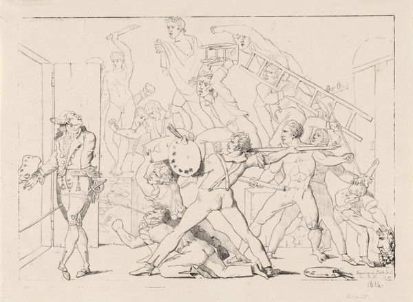 Editor: We're looking at "During the Fair," an ink drawing on paper by Theodor Alt, held at the Städel Museum. The sketchiness of the pen work gives it a feeling of spontaneity, like a quick snapshot of a bustling scene. What's your interpretation of this piece, considering its composition and details? Curator: Observe the dynamic interplay between the two distinct groups depicted. On the left, the figures seem to be engaged in solemn religious rituals near a church, while the figures on the right, in contrast, appear to be enjoying themselves in a festive gathering at a fair. Note how the artist uses line weight and density to differentiate these spaces. The figures on the left appear lighter, ethereal even, with their delicate lines. The figures on the right display more boldness and aggression through the lines of the pen. Editor: So the contrast is built into the materiality, as it were. The use of pen-and-ink itself reinforces this juxtaposition. Are there other elements of the visual language that enhance this? Curator: Consider the composition itself. The linear arrangement of the figures, segmented roughly into thirds horizontally, dictates how our eyes navigate the scene. Note the strategic use of implied lines and the spatial relationships crafted through careful mark-making. These aren't mere representations; they are formal devices. Editor: So, by focusing on the materiality and arrangement, we gain a deeper appreciation, understanding how those relationships inform the whole artwork and communicate a certain, somewhat dissonant, meaning. Thank you for illuminating that! Curator: Indeed. By engaging with these formal aspects, we start to unravel how artworks establish internal relations and generate signification.