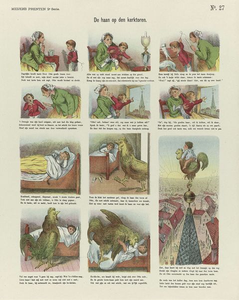 This chromolithograph titled "Kindervreugd", or "Children's Joy", was created by L. van Leer & Co. The print depicts a series of vignettes showing idealized scenes of domestic life centered around children. The image creates meaning through its depiction of gendered roles and social class. We see fathers providing toys while mothers are depicted caring for children and attending to their needs. The scenes suggest a comfortable, middle-class existence, with fathers as the providers for their family and mothers are nurturing caretakers. This popular print reflects conservative values of family life in the Netherlands, likely sometime in the late 19th or early 20th century. It would be important to look at books and periodicals popular during this time, and the historical context in which attitudes towards women and family were changing. Understanding this print requires historical research into the social conditions and popular attitudes prevalent at the time.