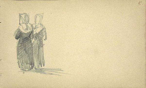 Curator: We’re looking at George Hendrik Breitner’s “Vier figuurstudies,” created sometime between 1880 and 1923. It’s a pencil drawing on paper. Editor: Sparse. A bit stark, almost melancholy. There’s a rawness to it—four figures rendered with such economical lines. Curator: Indeed. Notice how Breitner employs line not merely to define the figures but to suggest volume and texture. It’s fascinating to observe the interplay of positive and negative space in this composition. He doesn’t describe so much as he suggests. Editor: And I’m drawn to the immediacy, the almost frantic quality of the marks. The paper seems inexpensive. I wonder what sort of drawing Breitner would have been making—practice? Studies toward something more monumental? The swiftness reads as very practical to me. Curator: Given Breitner’s known fascination with the fleeting moments of urban life, wouldn't this mode of execution also fall perfectly in line with Impressionistic concerns? This study reflects the Impressionistic concept, using abstraction in line form as a tool to portray movement in life. Editor: It makes me wonder about the social context of the materials available to Breitner. This sketch tells me he was prioritizing efficiency. He's economizing materials and focusing on quickly conveying essential forms of ordinary figures. Curator: I find it's particularly interesting how he's reduced each figure to its barest structural essence. We get a sense of mass, of form, without laborious detail. This reductive approach amplifies the emotional impact. Editor: And thinking of the artist’s labor, the relative quickness in achieving even these fundamental sketches would speak to the intense pace and pulse of the industrializing Amsterdam of the late 19th century. Breitner was trying to catch up. Curator: His visual language echoes that sentiment perfectly. It's more than mere representation; it’s about evoking a feeling, capturing a passing moment in time with a powerful economy of means. Editor: Looking at how these observations cohere adds so much to our understanding, enriching what initially seemed like a fleeting sketch with broader stories of art and labor in 19th century Amsterdam.