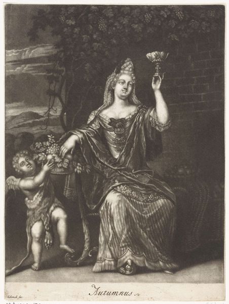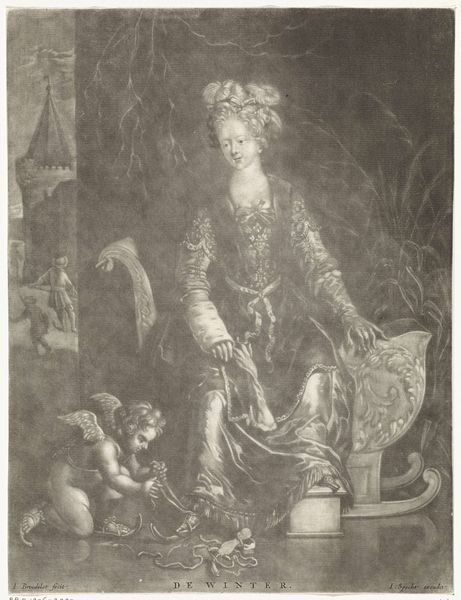 Pieter Schenk created this print, "Winter," around the turn of the 18th century using the mezzotint technique. It exemplifies the period’s allegorical approach to representing the seasons. Here, winter is embodied by a woman, elegantly dressed and seated on a sled. A cupid figure is attempting to light a fire, but the mood is far from warm; it's a poignant depiction of the season's starkness. The portrayal of women in allegorical roles provides insight into the period's gendered expectations. This print both reflects and reinforces the era's social hierarchy. While seemingly traditional, Schenk's piece offers a moment to consider the complex layers of identity and representation in art. It invites us to think about the experiences and stories that are often unseen, or unheard in these historical depictions.