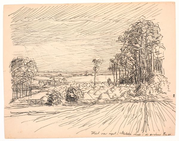 Fritz Syberg made this drawing, titled "Og Vinteren blev saa kold saa kold", or, "And the Winter became so cold, so cold" with ink on paper, though when, exactly, we don't know. What I find immediately striking is the hatching technique Syberg uses to create depth and texture. It’s a reminder that artmaking is a process of layering, of building something from simple marks. Look closely at the sky; notice the directional lines, almost like a curtain of rain or a gust of wind. It gives the scene a sense of movement. I love how this contrasts with the stillness of the snow-covered landscape. The ink is applied with varying pressure, creating lines that range from delicate whispers to bold statements. This reminds me a little of some of Van Gogh’s drawings, that shared intensity of mark-making to capture a feeling or a mood, less about representing what's in front of you and more like a conversation with it. In the end, it’s all about that conversation, isn’t it?