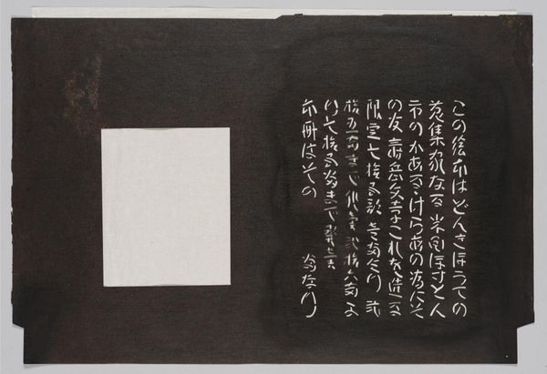 Curator: Here we have "Stencil for Illustrated Don Quixote (Ehon Don Kihōte)" by Serizawa Keisuke, currently residing in the Harvard Art Museums. Editor: Immediately, I sense a moodiness, a kind of weathered parchment whispering tales of old adventures, or perhaps just the scent of burnt umber. Curator: The artist has employed a resist-dyeing technique, katazome, achieving the text in striking contrast against the dark ground. It reads as if something is almost being obscured. Editor: There's a beautiful tension between the crisp white script and the almost aggressively stained texture—like a memory trying to surface from a murky dream. Does the text itself hint at Quixote's idealism clashing with reality? Curator: Precisely. The visual structure mirrors that thematic conflict, with its interplay of clarity and obfuscation. Editor: It's like stumbling upon a fragment of a long-lost, beautifully distressed book. Curator: Indeed. Keisuke's work uses form to truly capture the spirit of Cervantes’ masterpiece. Editor: A powerful reminder of how art can speak across centuries.