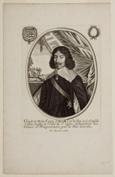 Editor: This is "Thomas, Lord Fairfax" by Jacobus Houbraken, housed here at the Harvard Art Museums. It looks like an engraving, with incredible detail. The mood is quite serious, befitting a Lord in armor. What strikes you most about this portrait? Curator: Oh, the elaborate frame within the print! It's practically bursting with symbolism. Notice the battle scene below Fairfax’s stern gaze, juxtaposed with the swirling ornamentation. It’s as if Houbraken is saying, "Here's a warrior, but also a man of his time, caught in a dance of power and aesthetics." What do you make of the oval shape? Editor: I guess it makes him seem... contained? Like a specimen, maybe? Curator: Precisely! It's a way of framing history, of presenting Fairfax as a figure both grand and… somehow, manageable. I'll be pondering that one a while! Editor: Absolutely! It’s more than just a portrait; it's a statement.