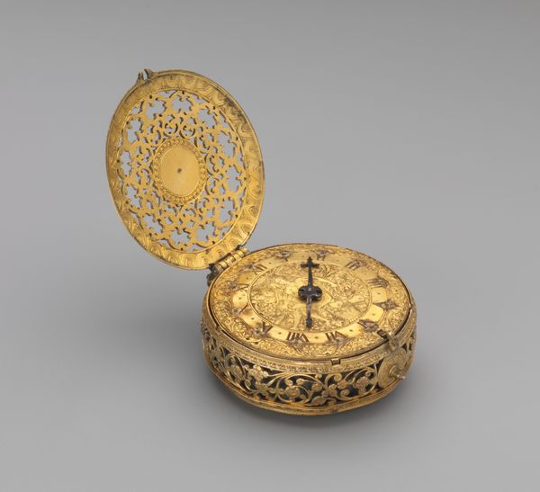 This clock-watch with alarm and calendar was crafted by Nicolas Forfaict around the year 1600, primarily from gilded brass and silver. The piercing of the brass case to create an intricate, lacy effect speaks to the maker's virtuosity. This wasn't just a functional object; it was a display of skill and affluence, with the precious metals involved reflecting the owner’s social standing. The labor-intensive processes—engraving, piercing, and assembly—highlight the value placed on craftsmanship during this period. These techniques link the piece to a broader history of metalworking, where artistry and engineering intertwine. Such an object signals the rise of a new kind of attention to time, one that was driven by emerging capitalism and the new emphasis on scheduling and productivity. This clock-watch represents more than just telling time; it embodies a shift in how time itself was perceived and managed. Ultimately, this piece encourages us to consider how materials, making, and cultural context converge to imbue objects with meaning. It challenges the conventional boundaries between craft and fine art, inviting us to appreciate the historical and social narratives embedded within.