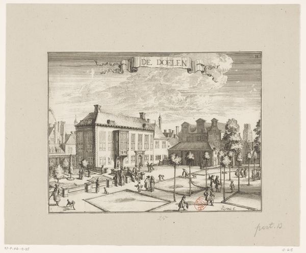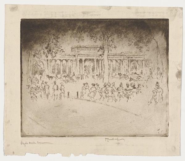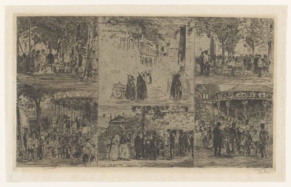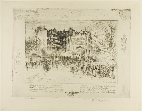 Editor: This is "Gezicht op Place des Martyrs-Juifs-du-Vélodrome-d'Hiver met de Taverne du Bagne bij nacht" created by Félix Hilaire Buhot in 1885. It’s an etching in ink and it really captures a city scene at night. It's somewhat eerie and desolate. What stands out to you in terms of its composition? Curator: What intrigues me first is Buhot's masterful control over the tonal gradations achieved through etching. Notice how he uses the varying densities of ink to define depth and atmosphere. How do you think the contrast between the illuminated Taverne and the dark surrounding space functions within the picture plane? Editor: It makes the Taverne the clear focal point. It’s like the light is drawing me towards it in the midst of the gloom. The details in the crowd are also lost in shadow. Is this an intentional stylistic choice? Curator: Precisely. Observe how the artist manipulates the surface of the print, creating textures that evoke a palpable sense of darkness. The blurred lines and tonal ambiguities encourage the viewer to engage with the work actively. Can you detect any formal relationships between elements of the foreground and background? Editor: The vertical lines of the buildings echo in the bare branches of the tree, perhaps? The placement of text as borders surrounding the cityscape suggests this is not merely a depiction but also an act of inscription. Curator: Precisely. It functions not only as an image, but also an object. Through the complex interplay of dark and light, Buhot asks us to look closely at the fundamental visual vocabulary of cityscape representation. What, for you, has been the most salient discovery in viewing this artwork through a formal lens? Editor: Considering Buhot's technical skill and purposeful placement of tonal variation. Before, I only perceived a melancholic night scene; now I can see how the formal components support such impression and add multiple layers of complexity and artistic choices.