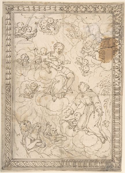 Giovanni Battista Gaulli made this drawing, "Allegory of the Immaculate Conception," using pen and brown ink with gray wash over black chalk. The linear quality of the drawing allows us to see the gridded structure underneath the image, revealing its early stages of planning. This grid is a fascinating, if often hidden, aspect of much art from this period. While the finished painting would hide the labor and math involved, here it’s laid bare. The composition and application of wash imbues the sketch with an ethereal, dreamlike quality, while the figures and textures are softly delineated. Gaulli was clearly a skilled draughtsman, and this drawing would have been a study for a larger painting. The rapid and confident lines suggest a mastery of technique developed through years of practice. It's important to remember the sheer effort involved in acquiring these skills. Ultimately, considering the materials, making, and the social context is crucial to fully appreciate Gaulli’s work, and to move beyond traditional boundaries separating art and craft.