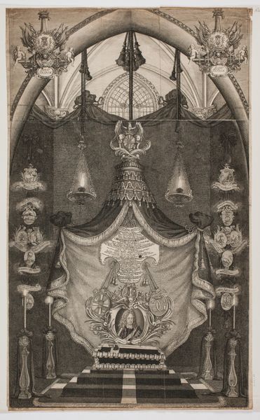 Editor: Here we have a print from 1610 titled "Funeral Effigy of Henry IV, King of France," currently held at the Metropolitan Museum of Art. It’s quite striking, and there’s almost a sense of performance around the presentation of death here. What symbols or messages are you seeing in this piece? Curator: Indeed. The imagery speaks volumes about the cultural memory being constructed. Note the repetition of the fleur-de-lis— a powerful emblem of French royalty – woven into every surface. This insistent visual echoes the continuity of the monarchy, even in death. How does the positioning of Henry’s hands strike you, coupled with the crown and royal regalia displayed at his feet? Editor: They're clasped in prayer, but the crown at his feet, almost like discarded footwear, suggests a transition, maybe from earthly power to divine judgment? Curator: Precisely! Consider also the candles. Light is a symbol often associated with knowledge and faith, their placement at the edges representing enlightenment illuminating mortality. Does the density of ornamentation – the patterns and symbols – suggest a specific psychological function for the mourners or for the image itself? Editor: It feels almost like an attempt to control the chaos of death by imposing order and reinforcing beliefs about the afterlife, about royal power... a way to process communal grief through prescribed visual language. Curator: An excellent point. It shows how an image is less a literal record and more a concentrated vessel of symbolic and psychological resonance, shaping how people remember, mourn, and even challenge history itself. What is your final impression? Editor: I had not noticed the repetition of the Fleur-de-lis symbol which clearly marks Henry IV’s place in power but it now clearly indicates a transition between two worlds while showing respect for those he left behind. Thank you. Curator: Indeed, the cultural echoes in this image resonate long after Henry's death, reminding us how symbols help to preserve memory and negotiate complex emotions over time.