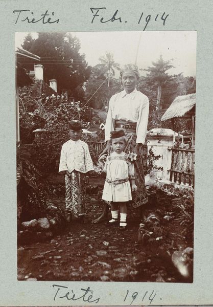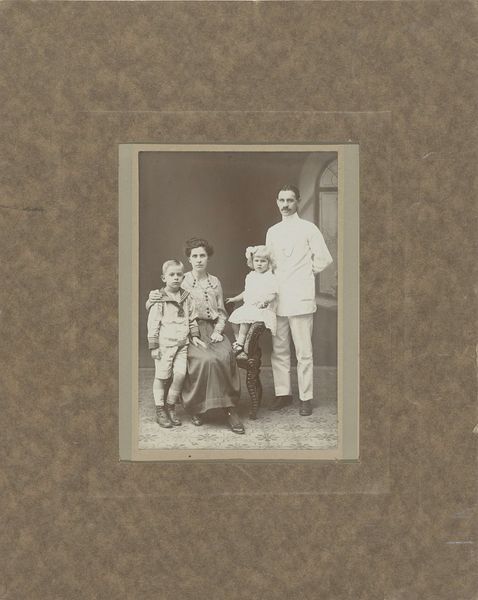 This is a photograph by Frits Freerks Fontein Fz., probably made around 1915, it depicts a family portrait on a veranda, using a brown monochrome palette. You know, sometimes, the lack of color can actually bring you closer to the emotional core of a scene, like looking at an old memory. The physical qualities of the photograph, its grainy texture and sepia tones, really strike me. It's like the image itself is aging, mirroring the passage of time for the family captured within it. The slight blurring around the edges gives it a dreamlike quality, as if the scene is not quite real but rather a figment of someone's imagination. I'm reminded of other early 20th-century photographers, like Alfred Stieglitz, who were also experimenting with capturing the essence of a moment in time, and it's always about finding the balance between clarity and ambiguity, to allow space for imagination. It reminds us that art is an ongoing conversation.