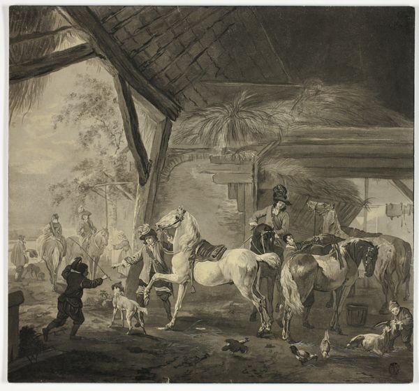 Curator: Ah, yes. Let's talk about Jean Moyreau’s engraving, "Jachtgezelschap, vertrekkend uit een stal," or "Hunting Party Departing from a Stable," dating from approximately 1733 to 1762. Editor: What strikes me first is the stark contrast between the shadowy interior of the stable and the bright, almost luminous landscape outside. It’s like stepping from one world into another. It feels anticipatory, doesn’t it? Curator: Absolutely. Moyreau plays with light beautifully to accentuate that contrast. We have this meticulously rendered interior of a stable, crowded with figures, animals, and a hefty hayloft. But then, he introduces this almost dreamlike countryside. Genre paintings like these provided a form of cultural visibility for Europe's landed gentry and aristocratic societies. Editor: There's such detail. I see everyone from the central figures on horseback to those charming chickens pecking about near the foreground. I wonder about those who remain on the fringes of the hunt, watching the main action? Is it admiration, expectation, or maybe something else? Curator: Genre paintings like these capture those tensions beautifully; the spectacle for some can involve the exclusion of others. Here, we find some men and women assisting the preparation for the hunt, with others simply looking on from the benches to the right. One figure to the upper left watches down at them from what seems to be a balcony. Editor: And I think about the experience for Moyreau. Transferring such a dynamic scene to an engraving must have been painstakingly precise. Did he feel he was accurately representing reality, or shaping it in a particular way? Curator: That is the key question! Through precise lines and detailed shading, it almost becomes a theatrical stage—a carefully constructed representation of country life, more so than a mere reflection. It hints at the ideals and social hierarchies inherent within rural settings. The print also makes this reality accessible to a broad public in ways a painting does not. Editor: Right, the way he captured not just the activity but also the atmosphere! All those individual elements – light, landscape, characters – converging to make something greater. I'll certainly reflect more deeply on these pieces moving forward. Curator: Indeed, considering how a relatively simple medium—an engraving—manages to convey so much about societal life, it's fascinating to reflect on this print's intricate narrative.