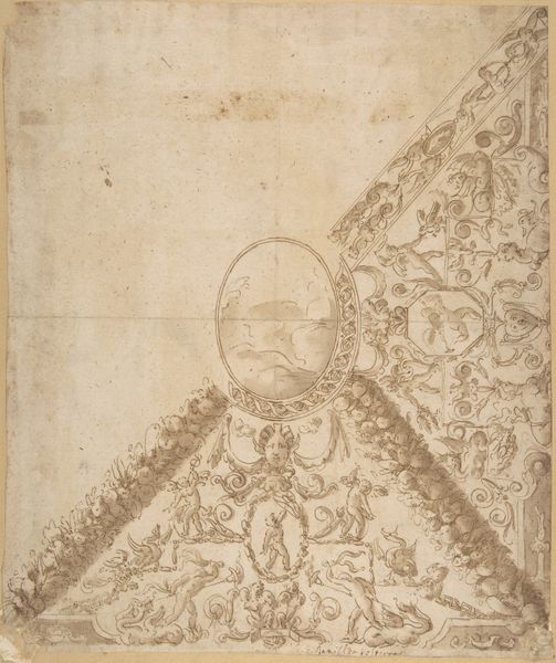 This is a design for a pendentive decoration, an ink drawing by an anonymous artist, currently held at the Metropolitan Museum of Art. The eye is immediately drawn to the symmetrical arrangement of figures within the triangular space, a composition which evokes a sense of classical harmony and balance. The curved base mirrors the arc of the central medallion, creating a visual echo that reinforces the overall structure. We find angels, with their gazes and gestures oriented toward the circle. It's worth noting the artist's preoccupation with depicting drapery, the use of line creating volume and movement. The linear quality here is not just descriptive; it's constructive. The varying densities of hatching create areas of light and shadow, lending depth to the otherwise flat surface. The empty circle at the centre of the composition could reflect a break from established norms, signaling a shift towards new ways of thinking about space, perception and representation. Rather than providing a definitive statement, this design invites contemplation on the interplay between form and function, and what it means to decorate.