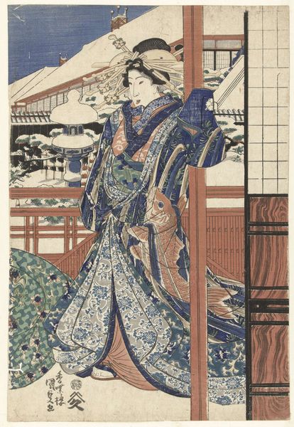 This woodblock print was created by Utagawa Kunisada in Japan. At its heart we find a woman carrying an umbrella, a motif that has journeyed through art history across cultures. The umbrella, in this context, is not merely protection from the elements. Think of similar depictions of the Madonna, often sheltered beneath a canopy, symbolizing protection and reverence. Here, the umbrella may represent a shield from worldly concerns, an emblem of status, or even a nod to the fleeting nature of beauty, much like the cherry blossoms encircling the cartouche. This imagery is not static; it evolves, adapting to new cultural landscapes. Each iteration echoes in the collective memory of those who view it, engaging our subconscious and linking us through a web of shared visual experience.
