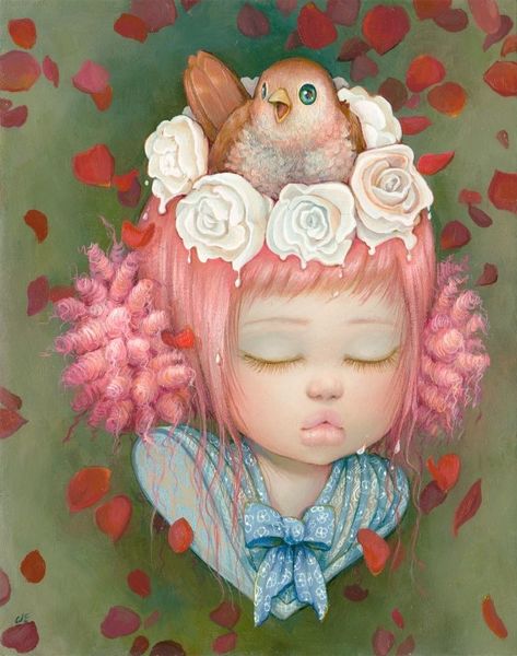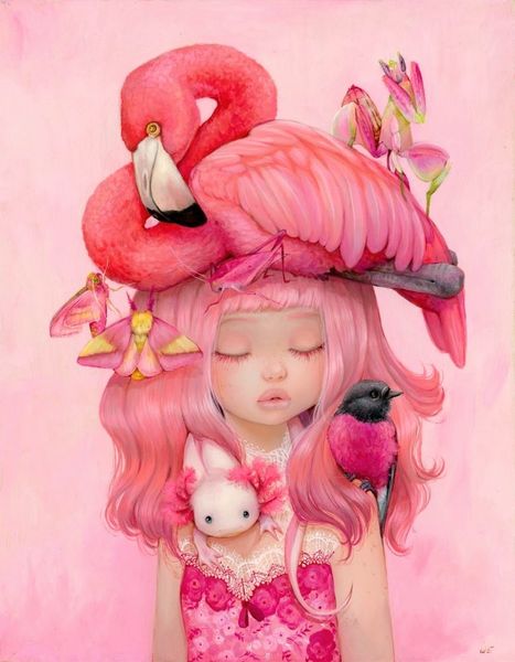 Editor: So, this is "Bombus" by Camilla d'Errico, from 2020. It looks like it's acrylic paint. It's kind of whimsical, a little girl holding what looks like a technicolor bumblebee. It's a little unsettling, to be honest, but in a cute way. What do you see in this piece? Curator: Let us observe the interplay of figuration and color. D'Errico uses acrylic to create a smooth, almost porcelain-like finish on the child’s skin, a stark contrast to the fuzzy texture of the…bombus. The juxtaposition draws attention to the artist’s control of medium and surface. What effect does this tactile difference produce? Editor: I guess it makes the bee seem almost unreal, like a plush toy rather than a real creature? The textures really clash. Curator: Precisely. Consider also the portrait format: the figure is centered, the background muted. The limited palette emphasizes the visual impact of the bee, directing our gaze and potentially acting as an allegorical figure representing transformation, like in surrealist art. The rainbow could point to this, by the way. Editor: So you are saying that the bee's disruptive color scheme affects the interpretation? Curator: It becomes central to our formal reading, yes. Disruptive isn’t quite the correct term, rather heightened through contrast with the girl's duller pallor. What is your impression of her face? Editor: Her wide-eyed expression? It's a common feature in a lot of contemporary portraits. There is also an element of wonder, or confusion maybe? Curator: Yes, it provides a counterpoint. Through close examination, the artist uses visual contrast to spark interpretive activity from the viewer. Editor: This has given me a different way to appreciate the balance of it all, I definitely look at it differently. Thanks! Curator: My pleasure. Hopefully it has offered insight into the process of rigorous looking and evaluation of technique.