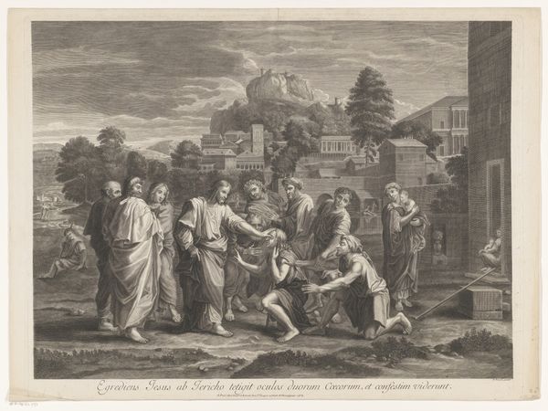 Thomas Holloway created this print, "Christus met de discipelen," at an unknown date. Immediately, the eye is drawn to the tonal gradations, moving from dark foreground figures to the ethereal background. The medium, likely engraving or etching, allows for the creation of fine, precise lines that delineate the figures and landscape, giving a sense of classical order. This carefully constructed composition speaks to a moment of divine encounter, yet it is rendered with an almost scientific precision. The positioning of Christ and his disciples creates a semiotic interplay between the sacred and the human, challenging traditional religious iconography. The work is less about religious devotion and more about an exploration of form and the representation of space. The use of line and tonal contrast serves not just to depict a biblical scene, but to engage with broader questions of perception, representation, and the structural elements of visual language. It encourages us to consider how meaning is constructed through visual codes rather than simply reflecting pre-established religious narratives.