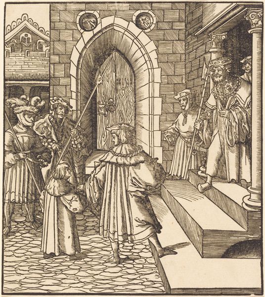 Curator: The intricacy of line in this Northern Renaissance woodcut is remarkable, isn't it? This print, created between 1514 and 1516, is entitled *The Old White King Sending His Messengers to Portugal*, and it’s by Leonhard Beck. Editor: It does feel…almost claustrophobic. So many figures crammed into the scene, all these rigid lines and patterns. Is that intentional? Like, is it a comment on power? Curator: Definitely. Consider the historical context: Maximillian I’s diplomatic efforts, his aspirations for a vast network of alliances. Beck’s woodcut is both propaganda and a visual representation of early 16th century European power dynamics. Note how the king, draped in that heavily patterned robe, sits enthroned, receiving messengers. There is such visual tension from his calm and centered energy, versus the messenger boy with such girlish innocence approaching. Editor: The detail is so compelling but the flattening of space and lack of tonal variation in the medium make it difficult for the eye. You know, I find the attempt at historical representation through what reads now as almost cartoonish imagery really fascinating. It is almost comedic with such high drama and heavy symbolism! What is in the king’s mind with such deep contemplation? Curator: You touch on an important point about Northern Renaissance art! The use of symbolic objects to reveal someone’s soul. A glass vessel on the left held with great care by a servant hints to ideas around purity and transparency. What might be considered objective renderings are actually highly constructed portrayals meant to guide moral interpretation. Editor: Ah, the old 'reading the signs' routine. It’s almost as if the objects become characters in their own right. So, we have historical propaganda masquerading as historical narrative with these inanimate narrators too! It's a fascinating, if somewhat heavy-handed, layering of message upon message. Curator: It makes you think, what narratives are we crafting now, consciously or unconsciously? What symbols are we embedding, and what interpretations will they invite centuries from now? Editor: A potent question. This isn't just history etched in wood, is it? It's a mirror reflecting our own ways of seeing, and our persistent habit of shaping narratives to serve the present.