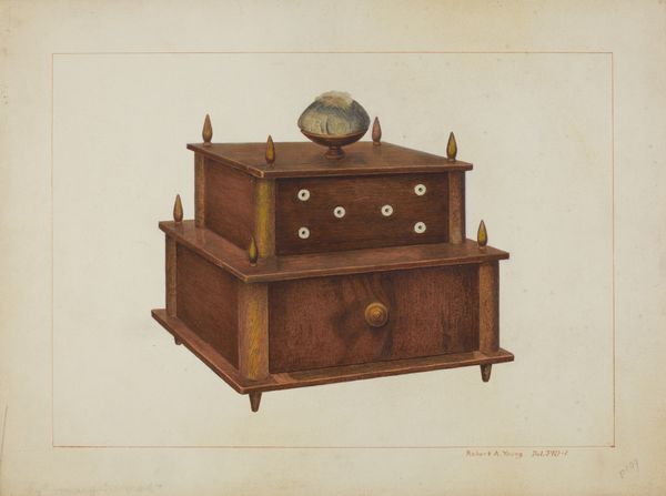 J. Howard Iams created this watercolor artwork called "Table - Double Lyre Base," focusing on furniture design. At first glance, the drawing presents a wooden table, its form and color immediately striking. The wood's rich, reddish-brown hue dominates, contrasted by the light background, emphasizing its texture and intricate patterns. Iams plays with geometric forms, juxtaposing the rectangular drawers and tabletop with the flowing curves of the lyre-shaped base. This interplay destabilizes the traditional, fixed meanings associated with furniture design, inviting us to reconsider functionality. Through a semiotic lens, the table embodies cultural codes of status and taste. The lyre base, a classical motif, suggests refinement and artistry. However, the drawing is not merely representational, it challenges the established meanings by blurring the lines between function and art. It serves as an ongoing interpretation of design, where aesthetic form intersects with cultural expression.