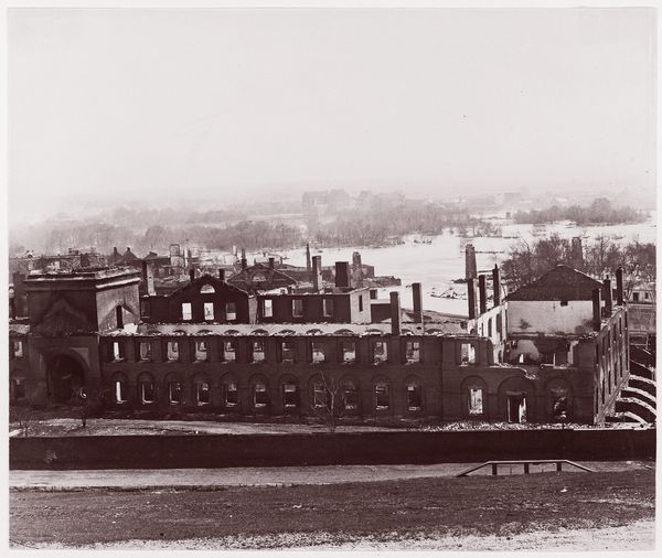 Editor: This gelatin silver print by Alexander Gardner, taken in 1865, captures the Ruins of Gallego Flour Mills in Richmond. The monochrome tones and the sheer devastation depicted evoke a deep sense of loss and finality. What strikes you most about this piece? Curator: Immediately, the scale speaks of profound historical trauma, rendered visible. Gallego Flour Mills wasn't just a building; it was an economic and symbolic heart of the Confederacy. Note how Gardner frames the ruins almost clinically, each shattered window like a vacant eye socket, bearing witness. The mill becomes a symbol of collapsed hopes, a literal crumbling of the Confederate dream. Does this resonate with your understanding of history-painting conventions? Editor: It does, in a way. I guess I hadn't thought of photography being used like that, for history painting, until now. There is this somber monumentality… Do you see other visual elements that amplify its message? Curator: Consider the horizon line, almost perfectly bisecting the image, separating the remnants of human endeavor from the vast, indifferent sky. It speaks to the ephemerality of power and the ultimate triumph of nature. Then look at the details, the heaps of debris juxtaposed with the surviving, skeletal structure; Gardner meticulously contrasts destruction and lingering resilience, inviting us to consider the cyclical nature of history itself. Editor: So, it’s not just about recording the event, but reflecting on its significance through symbolic imagery. Curator: Precisely! The image freezes a moment of intense transition. Gardner understood the psychological power of ruins—how they serve as potent reminders of past choices and present realities. Editor: I now see this photograph as so much more than just a document; it's a powerful meditation on memory and consequence. Thank you. Curator: My pleasure! Visual artifacts like this have the capacity to alter our understanding and leave enduring impact.