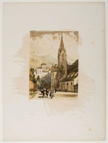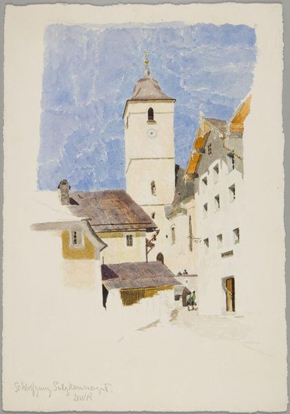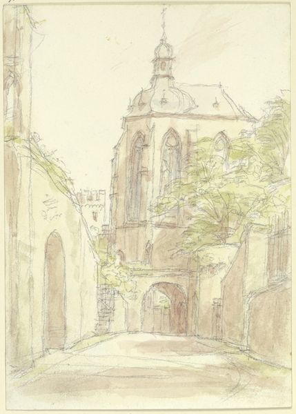 Editor: This is Dugald Sutherland Maccoll's "A Belfry at Dinan," housed at the Tate. The watercolor rendering creates a dreamlike, almost faded atmosphere. What strikes you most about its composition? Curator: The linear precision against the watery washes establishes a compelling tension. Note how Maccoll uses the belfry as a vertical anchor, counterpointed by the receding diagonals of the street. The muted palette further emphasizes the formal arrangement. Editor: So the color serves more as support for the structure rather than being the main event? Curator: Precisely. The structure dictates the mood. The artist focuses on the underlying framework of form and line to guide our reading of the piece. Editor: I see it now. I was too focused on the colors at first glance. Curator: Indeed, analyzing the formal elements reveals Maccoll's masterful control.