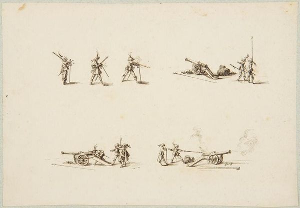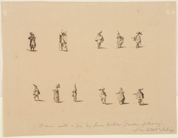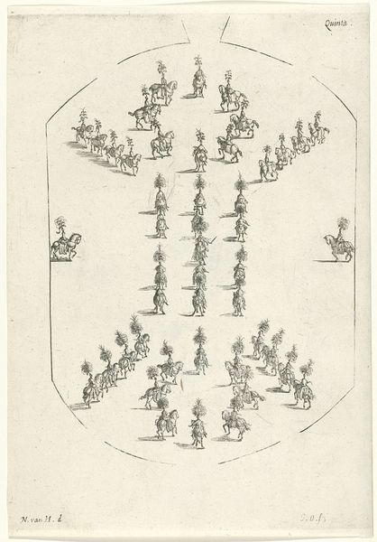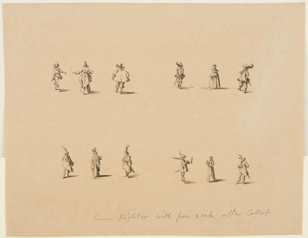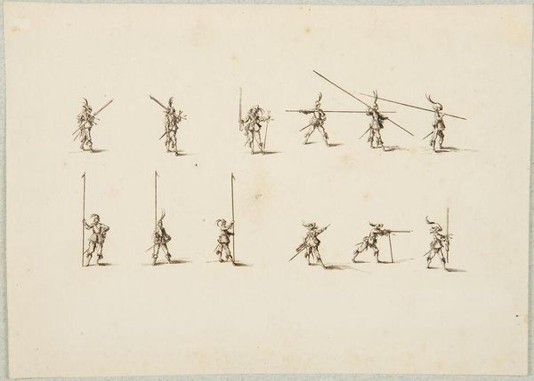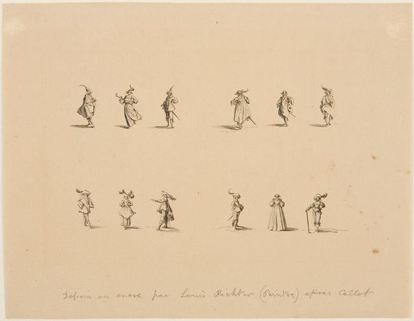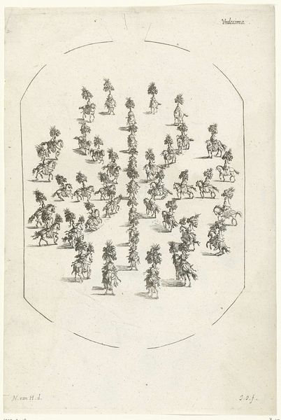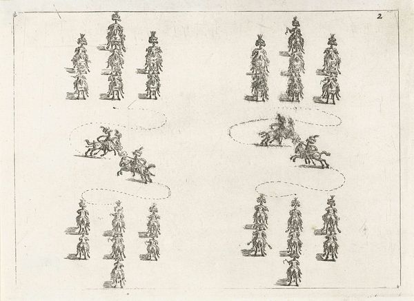 Editor: This is "Military Exercises, after Callot," by Adrian Ludwig Richter. It shows many tiny figures, all soldiers, in a uniform style. It's so delicate. What strikes you about this piece? Curator: The etching process is key here. How does the act of reproducing Callot’s images, likely for mass distribution, change the original’s context? Consider Richter's labor and the intended audience. Is this about venerating military might, or something else? Editor: So, it's less about the soldiers themselves and more about how the image was made and shared? Curator: Exactly! The means of production and consumption are central to understanding its meaning. Editor: I never thought about it that way. It's like thinking about the assembly line rather than the product. Curator: Precisely.