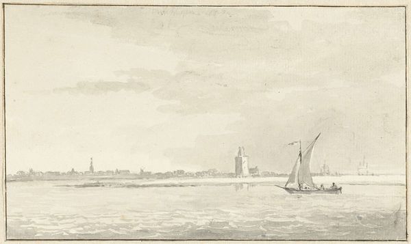 Editor: James McBey's watercolor and mixed media drawing, "Sunset at Maldon, Essex" from 1922, gives me a melancholy feeling. The colors are muted, the lines are gestural and quick, and everything feels... unfinished, maybe? What catches your eye when you look at this piece? Curator: It’s the quiet tension, I think. You feel the vastness of the sky, almost pressing down, don’t you? But it's the subtle color shifts in that sky—the barest whispers of rose and lavender—that keeps it from feeling oppressive. The composition, off-kilter as it is, somehow brings you into the scene. It reminds me of half-remembered dreams, impressionistic, evocative. McBey was known for his etchings, a very precise art. But here, he's allowing himself to be much freer. Editor: So the medium is freeing? I mostly see how gloomy it looks. Curator: Perhaps. Though maybe he's reflecting a post-war gloom. Maldon itself, while lovely, is on the cusp of the sea, right? Water always makes me ponder transition and reflection. It’s almost as if he's not just capturing a sunset, but a feeling—that in-between moment when the day's energy dissipates, and we're left to contemplate. Do you get any sense of movement from it, from the boats, perhaps? Editor: Now that you mention it, yes! The boats, the slightly blurred lines...it all feels fleeting, like a memory fading. I initially felt downbeat about the darkness but recognizing this impressionistic style makes me reflect. Curator: Exactly! It’s a landscape of the mind as much as it is a physical place. Which makes it all the more powerful.