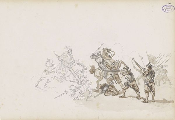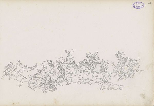 George Hendrik Breitner created this graphite drawing, "Veldslag en twee gewapende mannen in tuniek," which translates to "Battle and two armed men in tunics," a dynamic sketch that captures a scene of conflict and tension. The artist masterfully uses line and composition to convey a sense of chaos. The lower portion of the drawing depicts a battle scene with soldiers on horseback and on foot, engaging in combat. Breitner’s loose, energetic lines create a sense of movement and immediacy. The figures are rendered with minimal detail, yet their postures and gestures effectively communicate the intensity of the battle. Above this frenetic scene, the presence of two inverted figures draws the eye. This juxtaposition creates a visual dichotomy, contrasting the grounded chaos of the battle with the suspended, almost surreal, state of the figures above. Breitner’s choice of graphite allows for a range of tonal values, enhancing the dramatic effect. The stark contrast between the light paper and dark lines emphasizes the dynamism of the scene. The artist invites us to contemplate the multifaceted nature of conflict and human experience.
